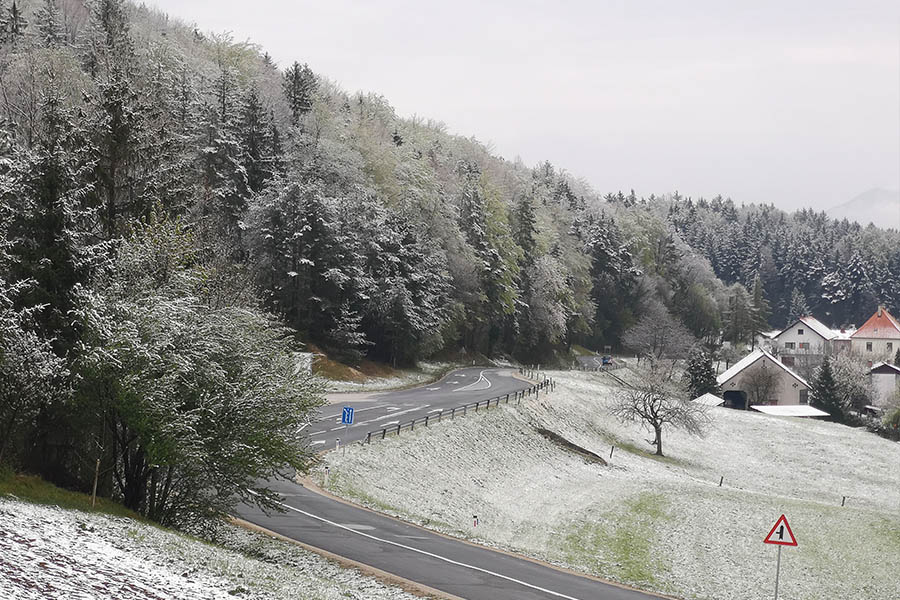 Ponekod po Sloveniji smo se prebudili v zasneženo jutro. Sneg je na Štajerskem ponehal padati okoli 9.00 ure zjutraj. Meja sneženja je bila na okoli 500 metrih nadmorske višine.